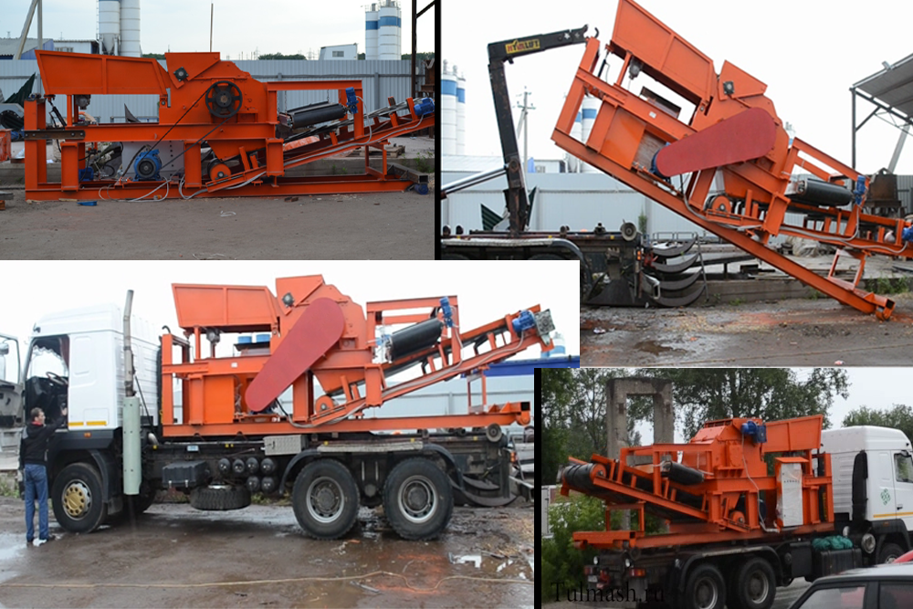 Загрузка исходного сырья производится в загрузочный бункер агрегата. После чего с помощью гидроцилиндра поднимается край бункера, и в результате под действием собственного веса и вибрации промышленного вибратора, материал попадает в зону измельчения.