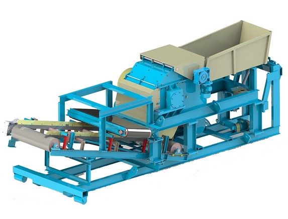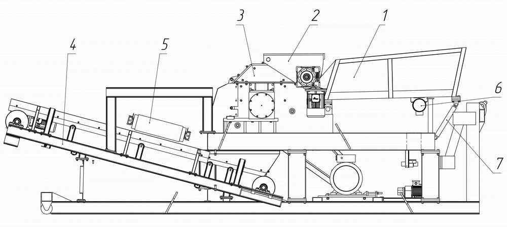 Измельчение сырье происходит ударным способом за счет удара сырья о молотки вращающегося ротора. Готовый продукт сквозь отверстия в решетке просыпается на разгрузочный конвейер. На раме над ленточным конвейером находится магнитный сепаратор (магнитная плита) Сепаратор способен уловить, притянуть и откинуть из готового сырья все металлические включения.