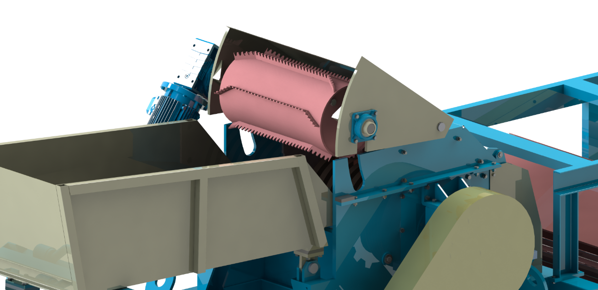 Под весом вращающегося валка и наличия на барабане валка гребенок с зубьями происходит первичное разрушения материала. Валок не только осуществляет предварительное разрушение, но и осуществляет дозированную и равномерную подачу сырья в камеру молотковой дробилки.